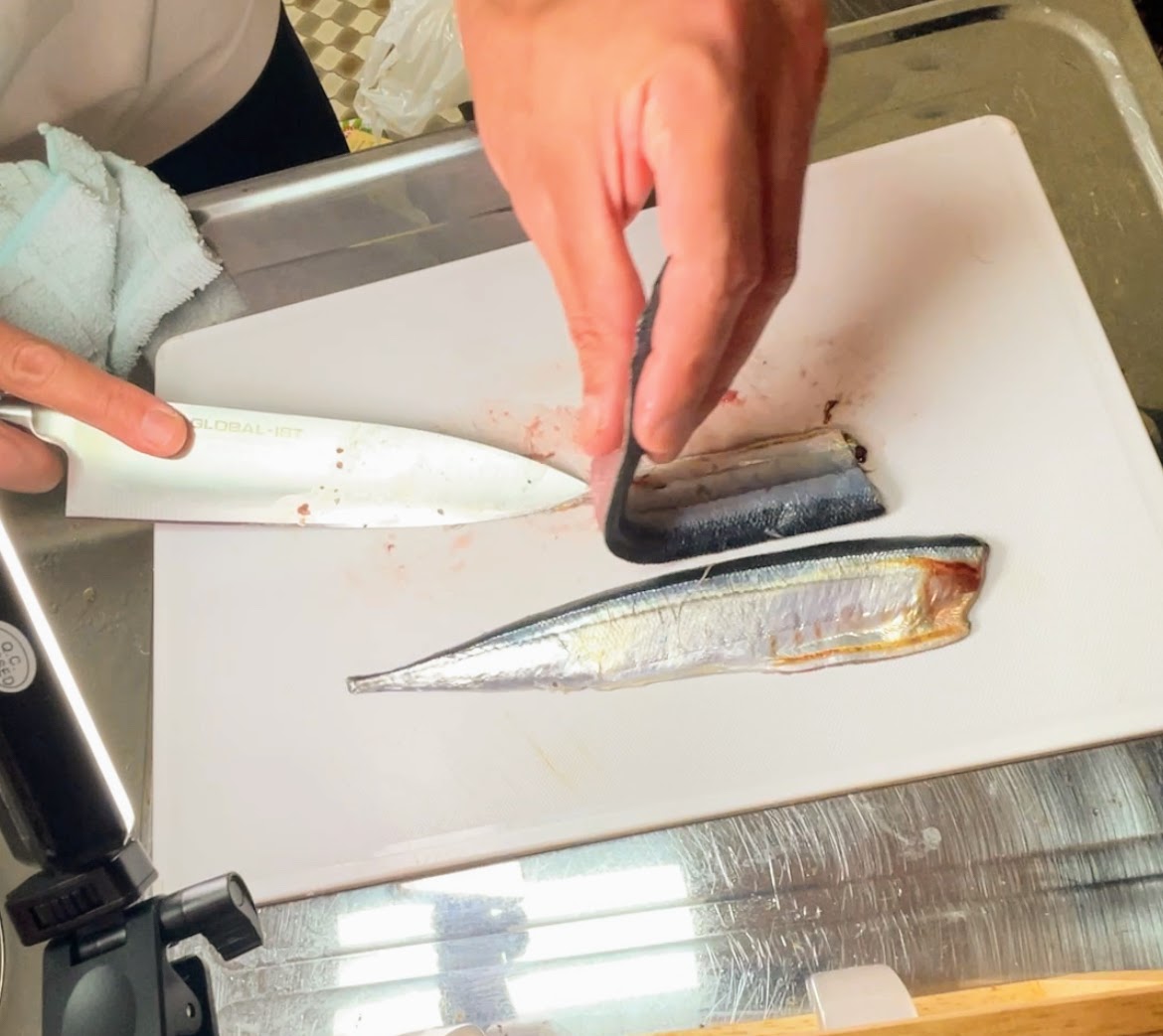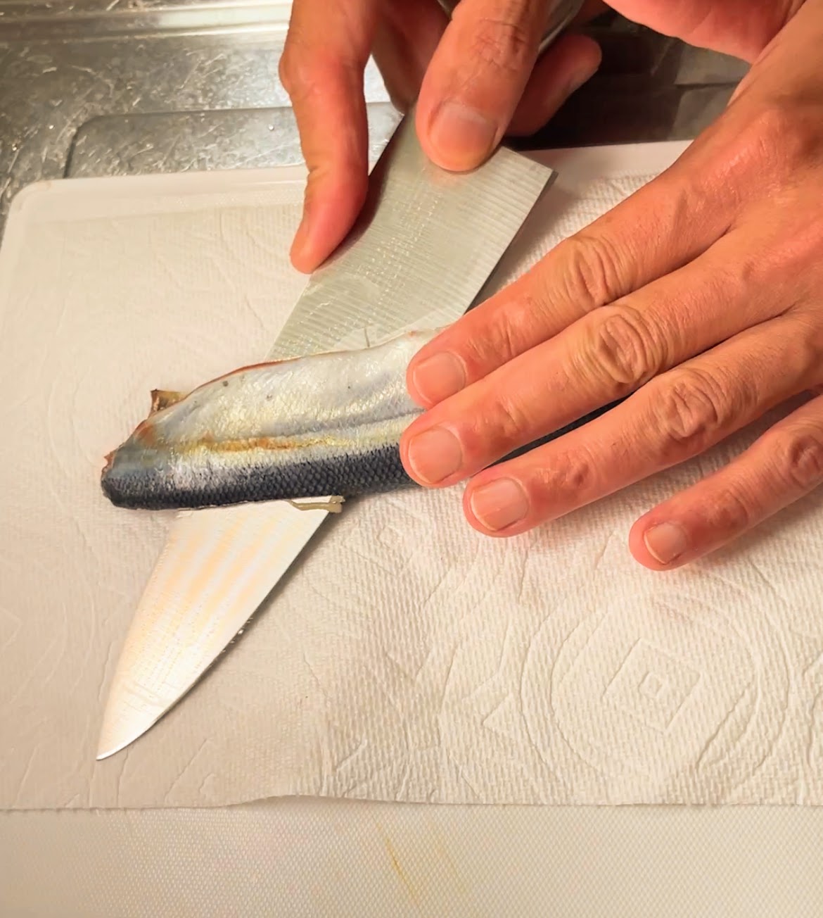 - サンマを三枚におろす。よく切れる包丁だとスムーズ。