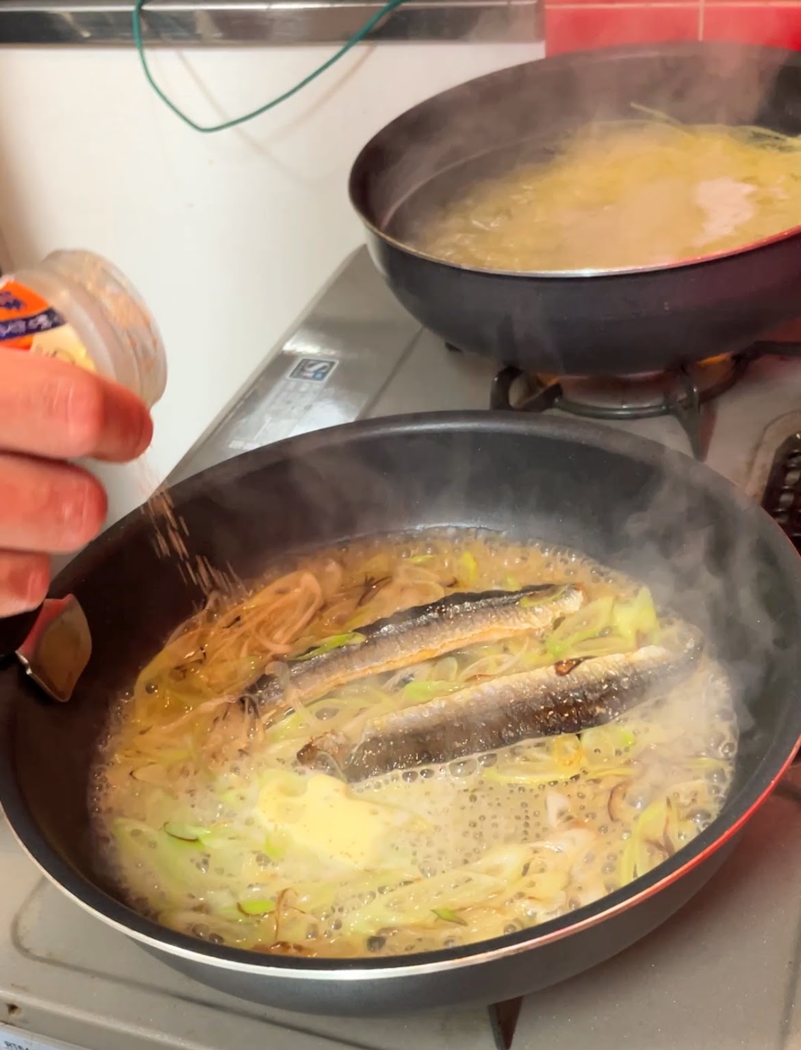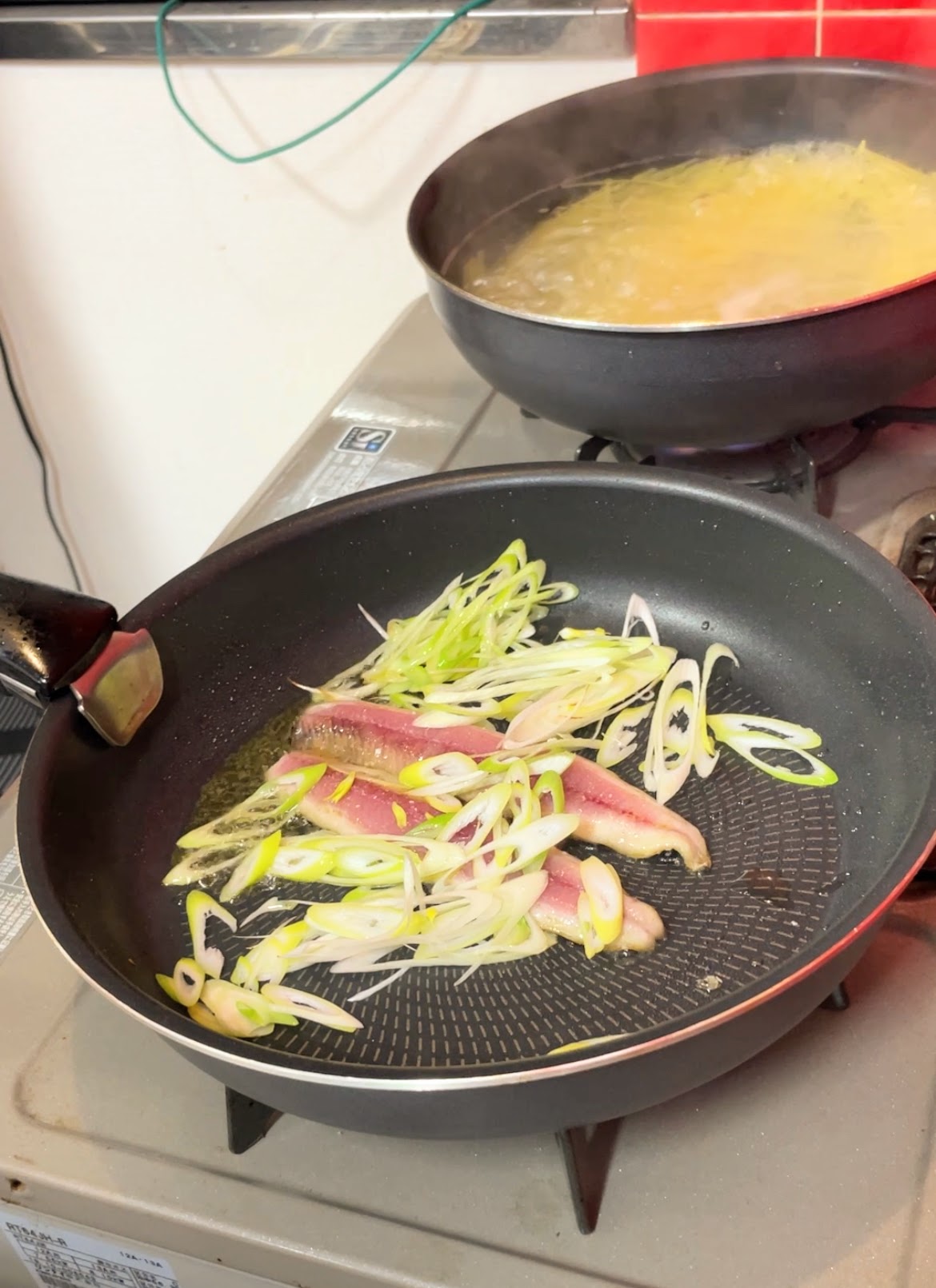 パスタを茹でるのは中華鍋の形を使い、フライパンでサンマを炒めて作っています。