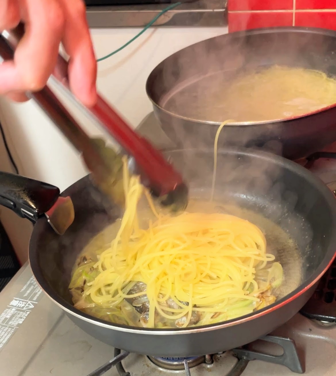 - ゆで上がったパスタをフライパンに入れて、味が薄かったら塩を入れる。